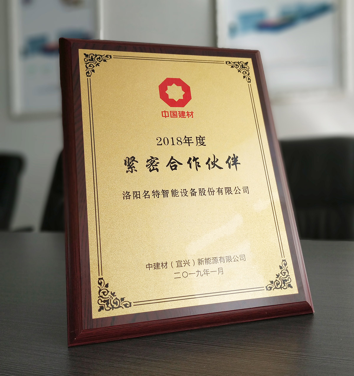 2019年初,我公司荣获中建材(宜兴)新能源有限公司授予的“2018年度紧密合作伙伴”殊荣!